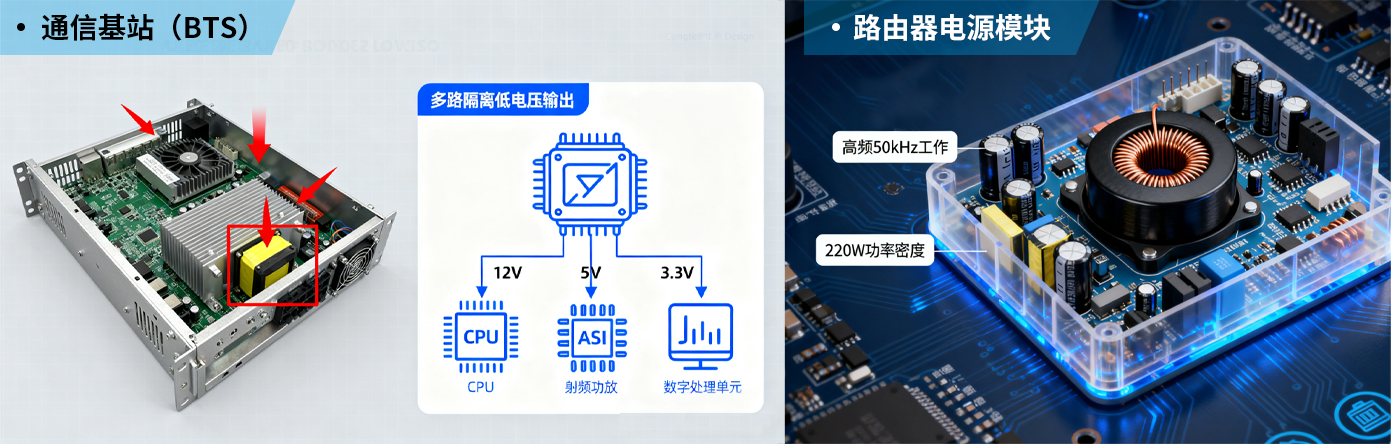 :为路由器、交换机、基站(BTS)、光传输设备(OTN/SDH)中的芯片(CPU,ASIC)、射频功放、数字处理单元等提供多路隔离的低电压(如12V,5V,3.3V)大电流直流电。