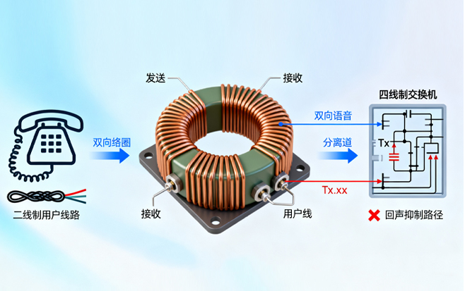 :完成二线制用户线路与四线制交换机内部电路的转换,实现双向通话并抑制回声。
